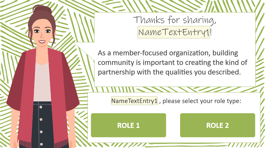In this example, the information being taught was the same but application would look very different based on the learner’s role. Instead of creating two different modules and tracking completion for two sets of learners, this module was created to support the largest audience of both role types. At the beginning of the module, the learner selects their role and throughout the course examples that are relevant to their role type populate as appropriate.